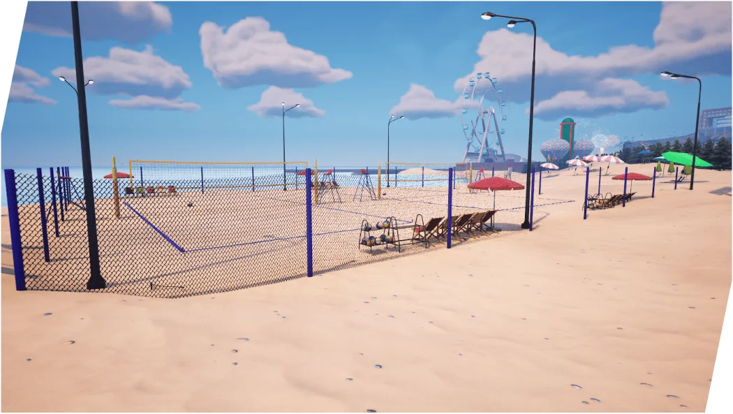 プレイヤーがゲーム内コインを貯めると、砂像や洞山、アスレチックやサイクリングエリアを開放でき、ゴールを目指します。